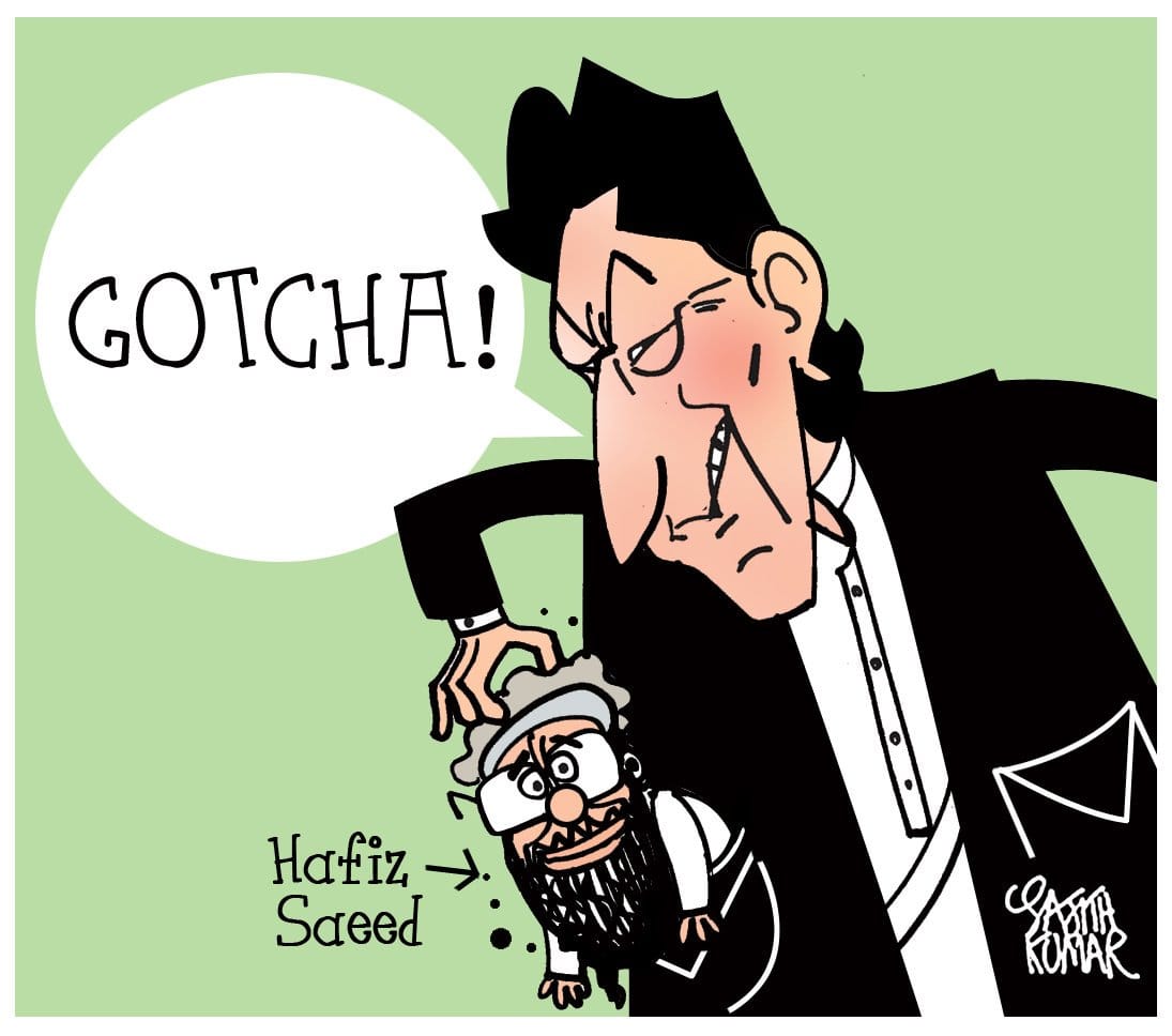 साजिथ कुमार पाकिस्तान के अधिकारियों द्वारा 26/11 के मास्टरमाइंड और जमात-उद-दावा प्रमुख हाफिज सईद की गिरफ्तारी का जिक्र करते हैं. कार्टूनिस्ट पाकिस्तान में आतंकवाद पर हो रही राजनीति को रेखांकित करते हुए.