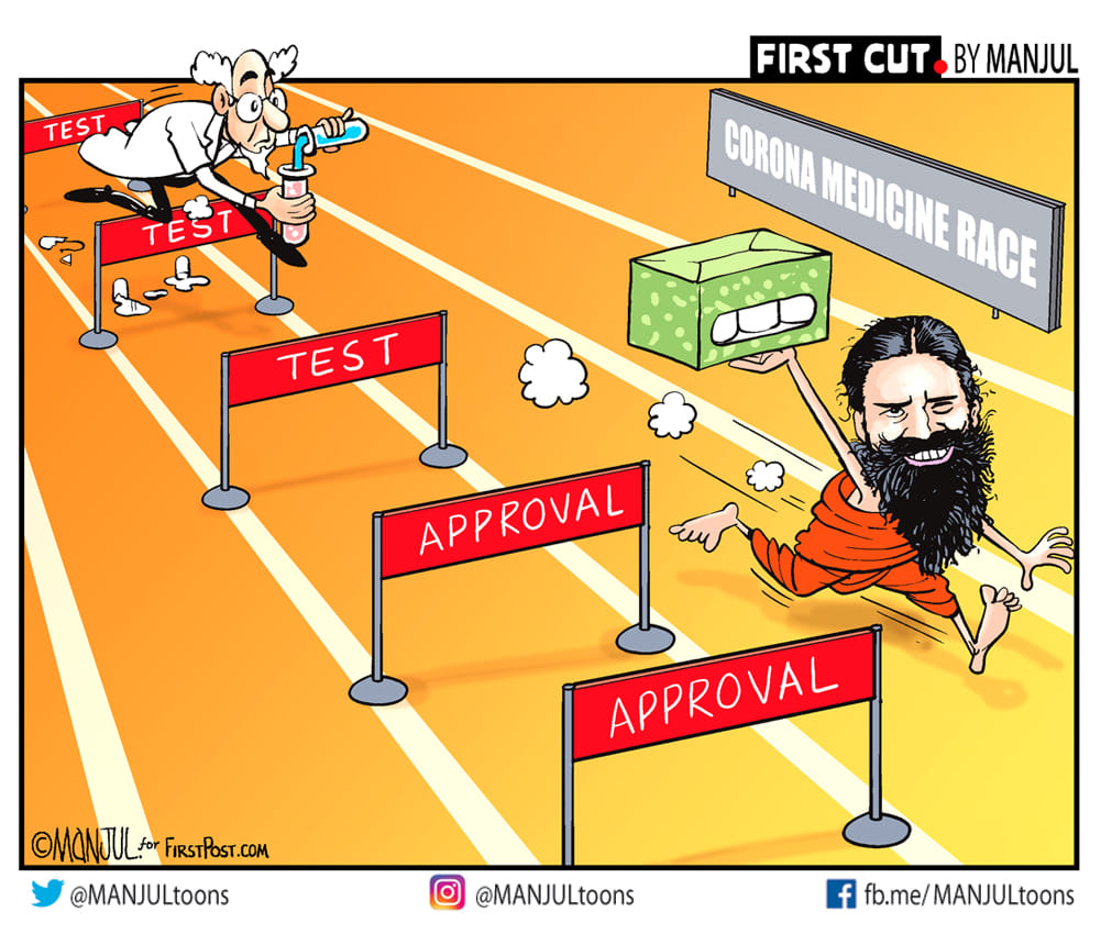 आज के फीचर कार्टून में आलोक निरंतर स्वामी रामदेव के पतंजलि के द्वारा बनायीं गयी कोरोनिल दवा को दर्शाते हैं, जो कि एक दवा है जो दावा करती है कि कोरोनवायरस को ठीक कर सकती है.