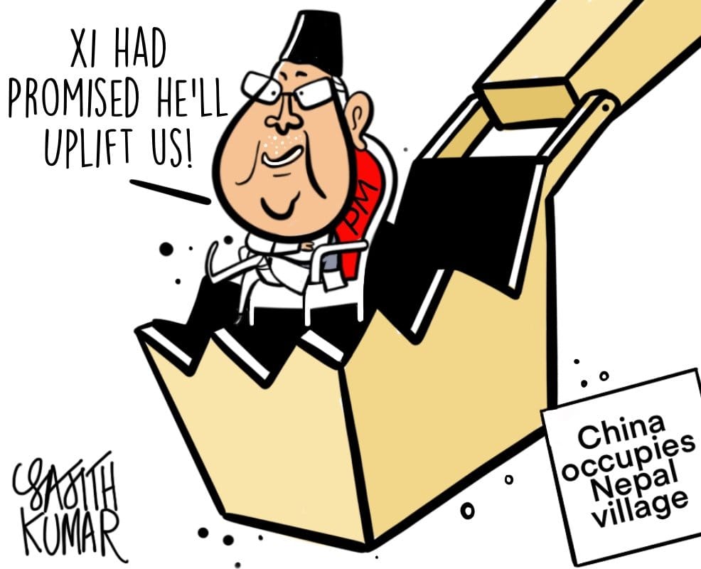 साजिथ कुमार डेक्कन हेराल्ड में नेपाली प्रधान मंत्री केपी शर्मा ओली की कठिन परिस्थिति को दर्शाते हैं. चीन ने नेपाल के साथ विश्वासघात किया और एक नेपाली गांव पर कब्जा कर लिया.