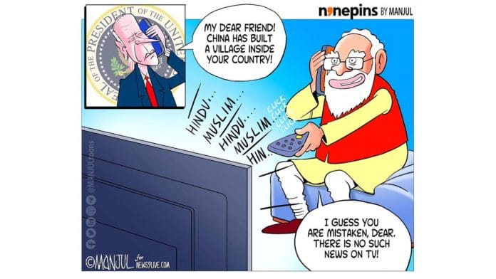 आज के फीचर कार्टून में मंजुल भारतीय मीडिया और पीएम नरेंद्र मोदी की आलोचना कर रहे हैं क्योंकि अमेरिकी कांग्रेस में पेंटागन की रिपोर्ट में चीन के अरुणाचल प्रदेश के विवादित क्षेत्र में 100 घरों का एक गांव बनाने की ख़बर भारतीय मीडिया से नदारद रही.