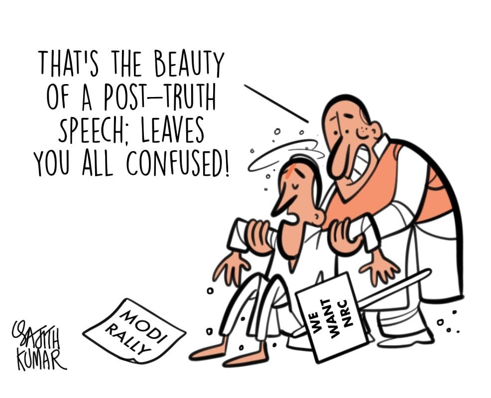 साजिथ कुमार प्रधानमंत्री के रामलीला मैदान के पोस्ट ट्रुथ भाषण पर तंज करते हैं.