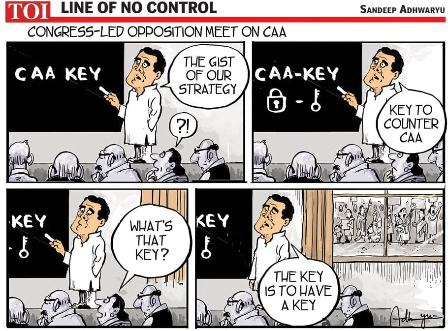 संदीप अधर्व्यु टाइम्स ऑफ इंडिया में विपक्ष पर कटाक्ष करते हैं उसकी सीएए के मुद्दे पर ठोस योजना तैयार करने में असफलता को चित्रित करते हैं.