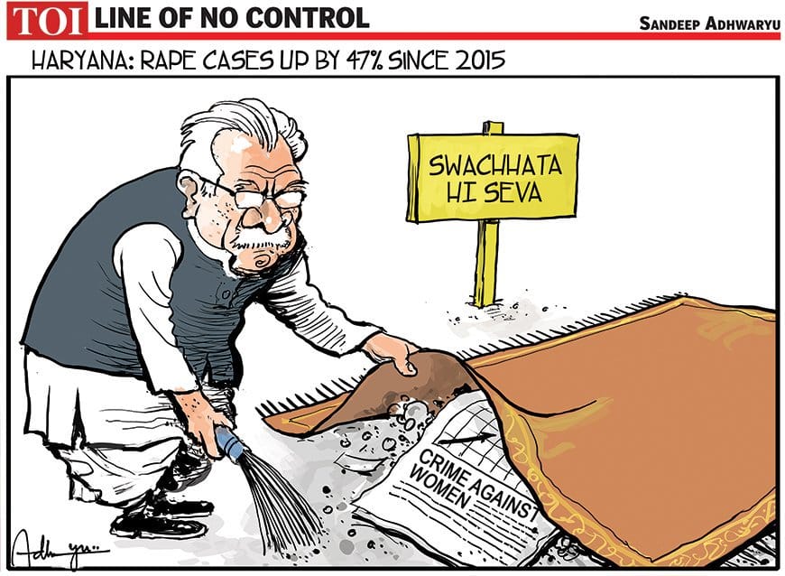 संदीप अध्वर्यु के अनुसार हरियाणा के मुख्यमंत्री मनोहर लाल खट्टर रेवाड़ी के गैंग रेप के मामलें पर अपनी टिप्पणी नहीं करके उसके ऊपर पर्दा डाल रहे है. कार्टूनिस्ट ने नरेंद्र मोदी सरकार की सफाई पहल ‘स्वच्छता सेवा’ को भी दर्शाया है. पिछले हफ्ते, हरियाणा में बस-स्टॉप से रेवाड़ी की 19 वर्षीय लड़की का अपहरण किया गया था और उसके बाद नशे की हालत में गैंग-रेप किया गया था.