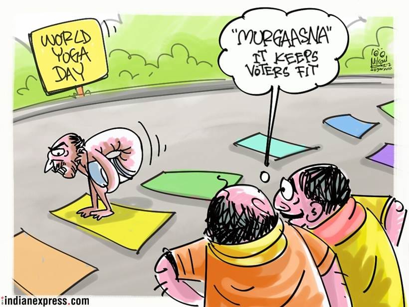 द इंडियन एक्सप्रेस के लिए अपने कार्टून में इंटरनेशनल वर्ल्ड योग दिवस की थीम लेते हुए मीका अजीज़ टिप्पणी करते हैं कि मतदाताओं को हमेशा बेवकूफ बना दिया जाता है और राजनेताओं द्वारा दंडित किया जाता है।