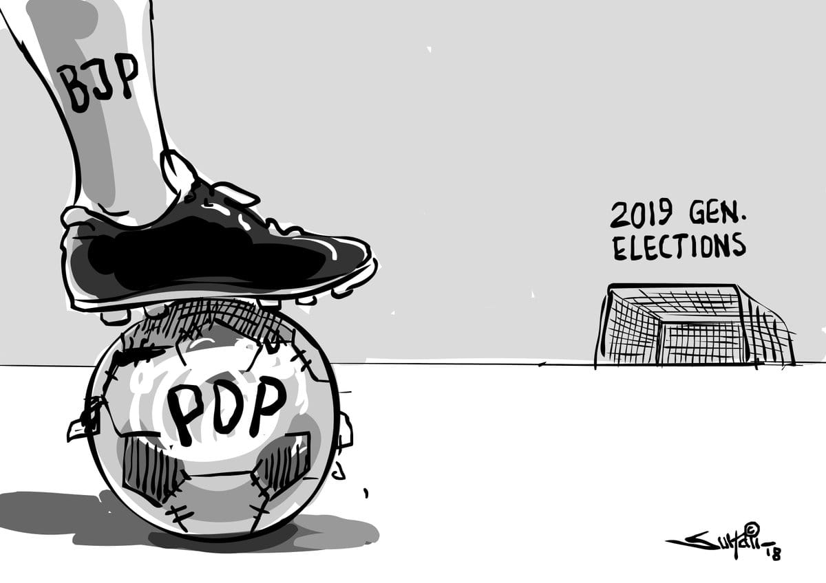 कार्टूनिस्ट गोकुल गोपालकृष्णन पीडीपी के साथ गठबंधन तोड़ने के बीजेपी के फैसले पर तंज करते हैं। गोपालकृष्णन ने बीजेपी के राष्ट्रीय सचिव राम माधव को गठबंधन तोड़कर कश्मीर छोड़ने का आह्वान किया। भाजपा ने पीडीपी के आत्मविश्वास को जीता था अब इसे खो दिया है।