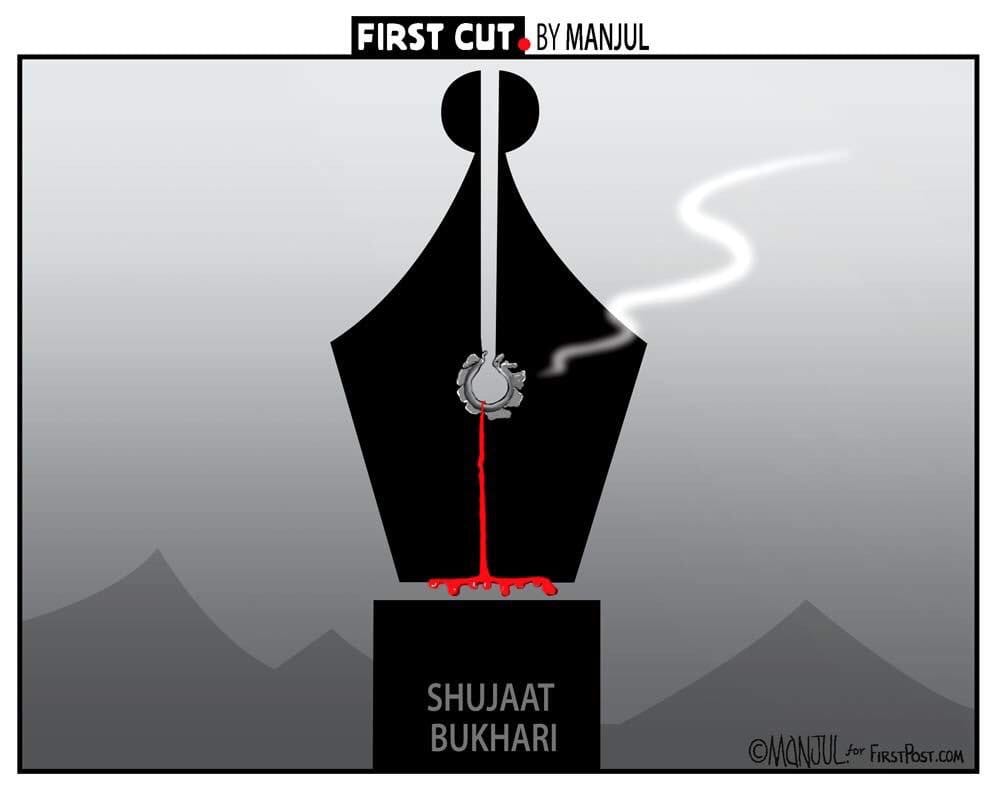 गुरुवार शाम की हत्या के बाद कई कार्टूनिस्टों ने कश्मीरी पत्रकार शुजात बुखारी को श्रद्धांजलि अर्पित की। आलोक निरंतर ने सुझाव दिया हालांकि बुखारी, गौरी लंकेश, नरेंद्र दाभोलकर, गोविंद पंसारे और एमएम कलबुर्गी की मौत हो गई है, विचारों की शक्ति लगातार और मजबूत हो रही है।