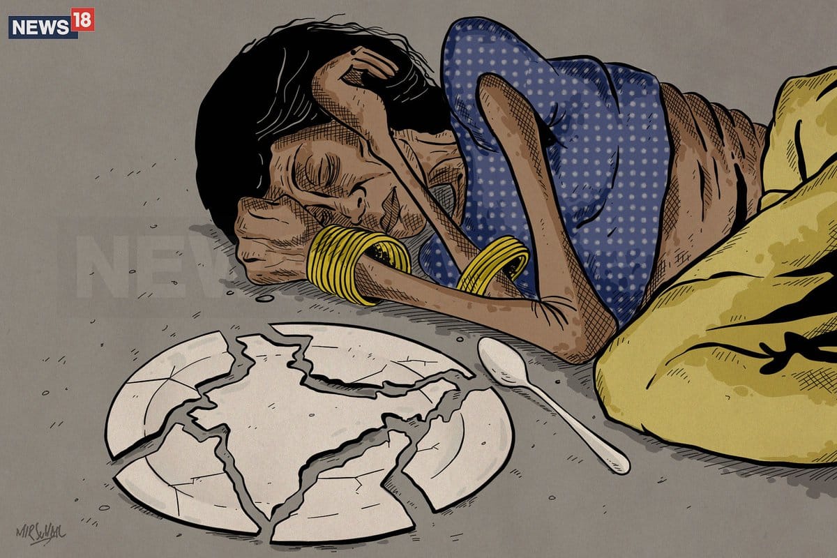 न्यूज़ 18 के लिए अपने कार्टून में मीर सुहैल झारखंड के एक आदिवासी परिवार में भुखमरी से मौत और इसके बारे में राज्य द्वारा दिखाई गई उदासीनता को चित्रित करते है।