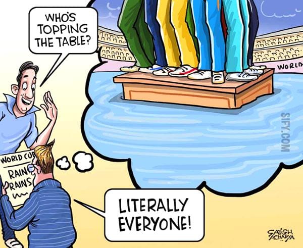 सतीश आचार्य इंग्लैंड में चल रहे विश्व कप में बारिश के चलते मैच न होने पाने को दर्शाते हैं. बारिश के कारण सभी टीमें अंक तालिका में पहले पायदान पर हैं.