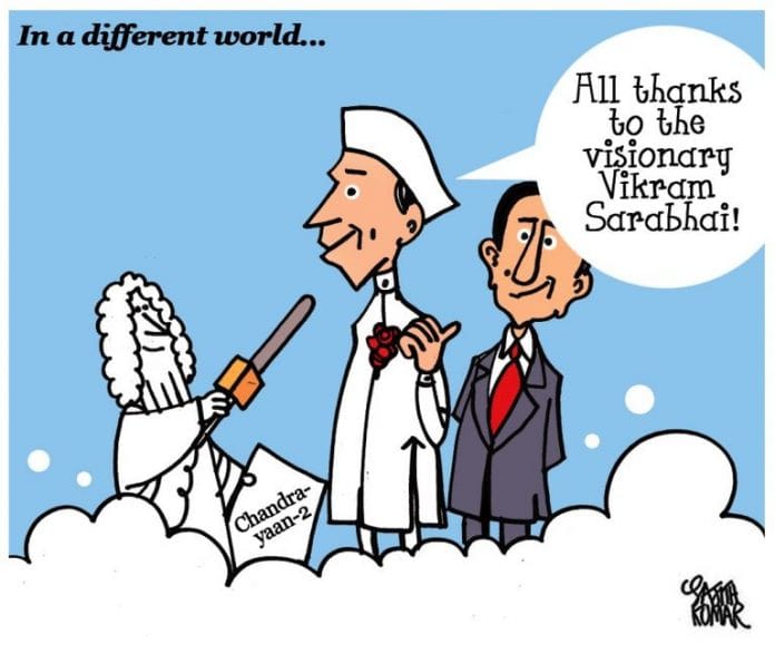जैसा ही इसरो ने चंद्रयान-2 के लॉन्च की तारीख की घोषणा की कार्टूनिस्ट साजिथ कुमार ने देश के पहले प्रधानमंत्री जवाहरलाल नेहरू को भारत के चंद्रयान मिशन के लिए विक्रम साराभाई को श्रेय देते हुए मोदी सरकार पर कटाक्ष किया है. साराभाई को भारत के अंतरिक्ष कार्यक्रम का जनक माना जाता है.