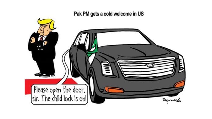 आज के कार्टून में आर प्रसाद ने पाकिस्तान के साथ अमेरिका के हालिया राजनैतिक अपमान का चित्रण किया है जिसमें वाशिंगटन के शीर्ष अधिकारियों ने देश में उनकी पहली यात्रा का स्वागत नहीं किए जाने को दर्शाया है.