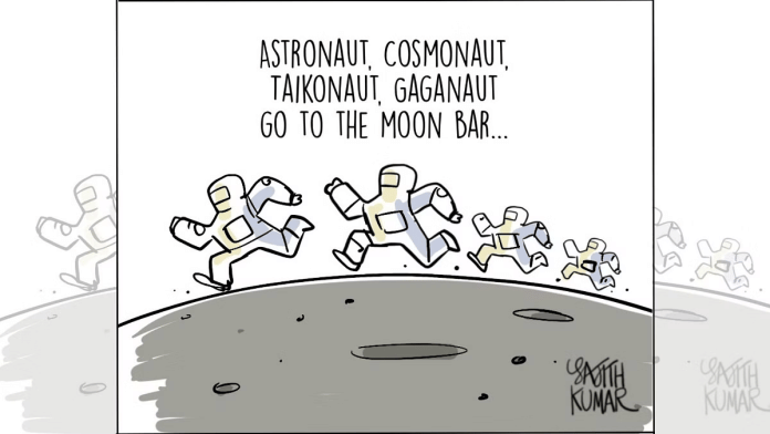 सतीश आचार्य अपने चित्रण में 23 अगस्त को शाम 6:04 बजे चंद्रमा पर चंद्रयान-3 की बहुप्रतीक्षित सॉफ्ट लैंडिंग के बारे में बता रहे है.