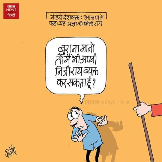 बीबीसी न्यूज़ हिंदी के लिए कीर्तीश भट्ट ने भोपाल से भाजपा की लोकसभा प्रत्याशी प्रज्ञा ठाकुर की टिप्पणी राष्ट्रपिता महात्मा गांधी के हत्यारे नाथूराम गोडसे को देशभक्त कहने पर कटाक्ष करते हैं.
