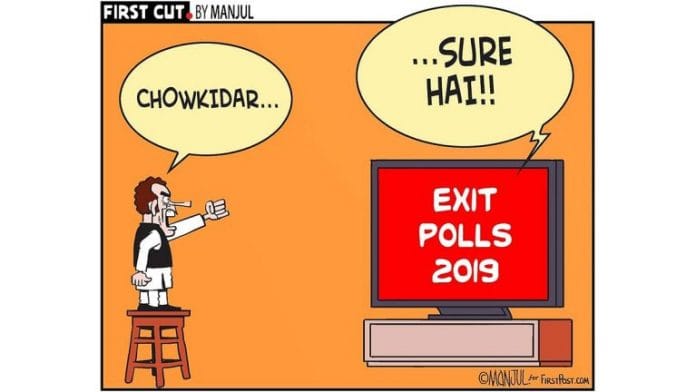 एग्ज़िट पोल में प्रधानमंत्री नरेंद्र मोदी और उनके भाजपा नीत राष्ट्रीय जनतांत्रिक गठबंधन को शानदार जीत की भविष्यवाणी करने पर मंजुल कांग्रेस अध्यक्ष राहुल गांधी और उनके नारे ‘चौकीदार चोर है’ पर कटाक्ष करते हैं.