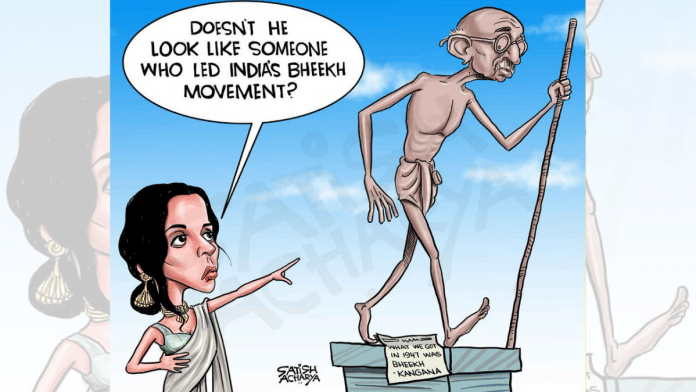 आज के फीचर कार्टून में सतीश आचार्य ने अभिनेत्री कंगना रनौत के उस बयान की आलोचना की है जिसमें उन्होंने कहा है कि भारत को 1947 में स्वतंत्रता ‘महात्मा को कटोरे’ में भीख के रूप में दी गई थी. कंगना ने हाल ही में कहा था कि 2014 में नरेंद्र मोदी की सरकार बनने के बाद ‘वास्तविक’ स्वतंत्रता मिली है.