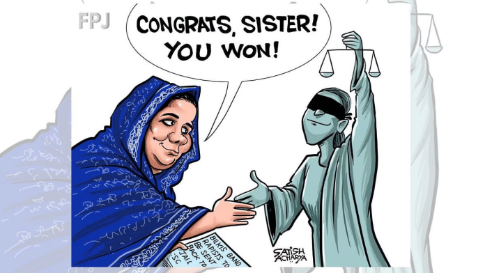 साजिथ कुमार का कार्टून भी बिलकिस बानो फैसले का जिक्र करता है. जबकि गुजरात अदालत के फैसले की कई लोगों ने महिलाओं के अधिकारों और न्याय के लिए क्षति के रूप में आलोचना की थी, सुप्रीम कोर्ट के हालिया फैसले ने इस वादे में आशा बहाल की कि बिलकिस बानो के बलात्कारियों को वह न्याय मिलेगा जिसके वे हकदार थे.