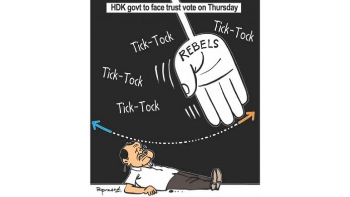 आर प्रसाद ने अपने कार्टून में निराश कर्नाटक के मुख्यमंत्री एचडी कुमारस्वामी को दर्शाया है. कांग्रेस और जेडीएस के विधायकों के इस्तीफे के बाद 18 जुलाई को सरकार फ्लोर टेस्ट का सामना करेगी. यदि बागी विधायकों का इस्तीफा स्वीकार किया जाता है, तो कांग्रेस-जेडीएस गठबंधन विधानसभा में अपना बहुमत खो देगा.