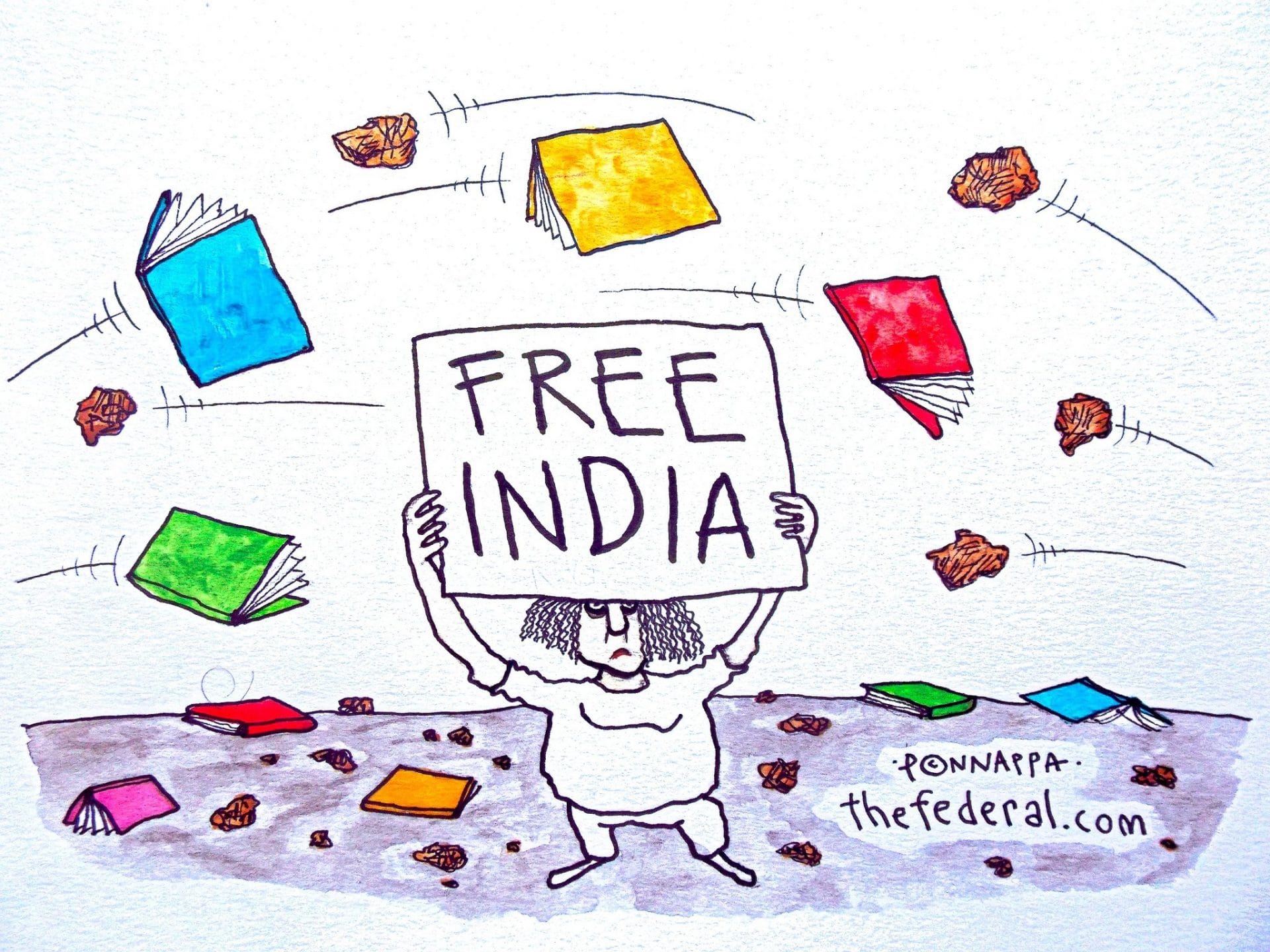 नाला पोनप्पा बताते हैं कि मुंबई में प्रोटेस्ट के दौरान ‘फ्री कश्मीर’ का पोस्टर ली हुई महिला के खिलाफ एफआईआर दर्ज हुआ है. नाला पोनप्पा विभिन्न छात्र-नेतृत्व वाले विरोध प्रदर्शन को दर्शाते हैं.