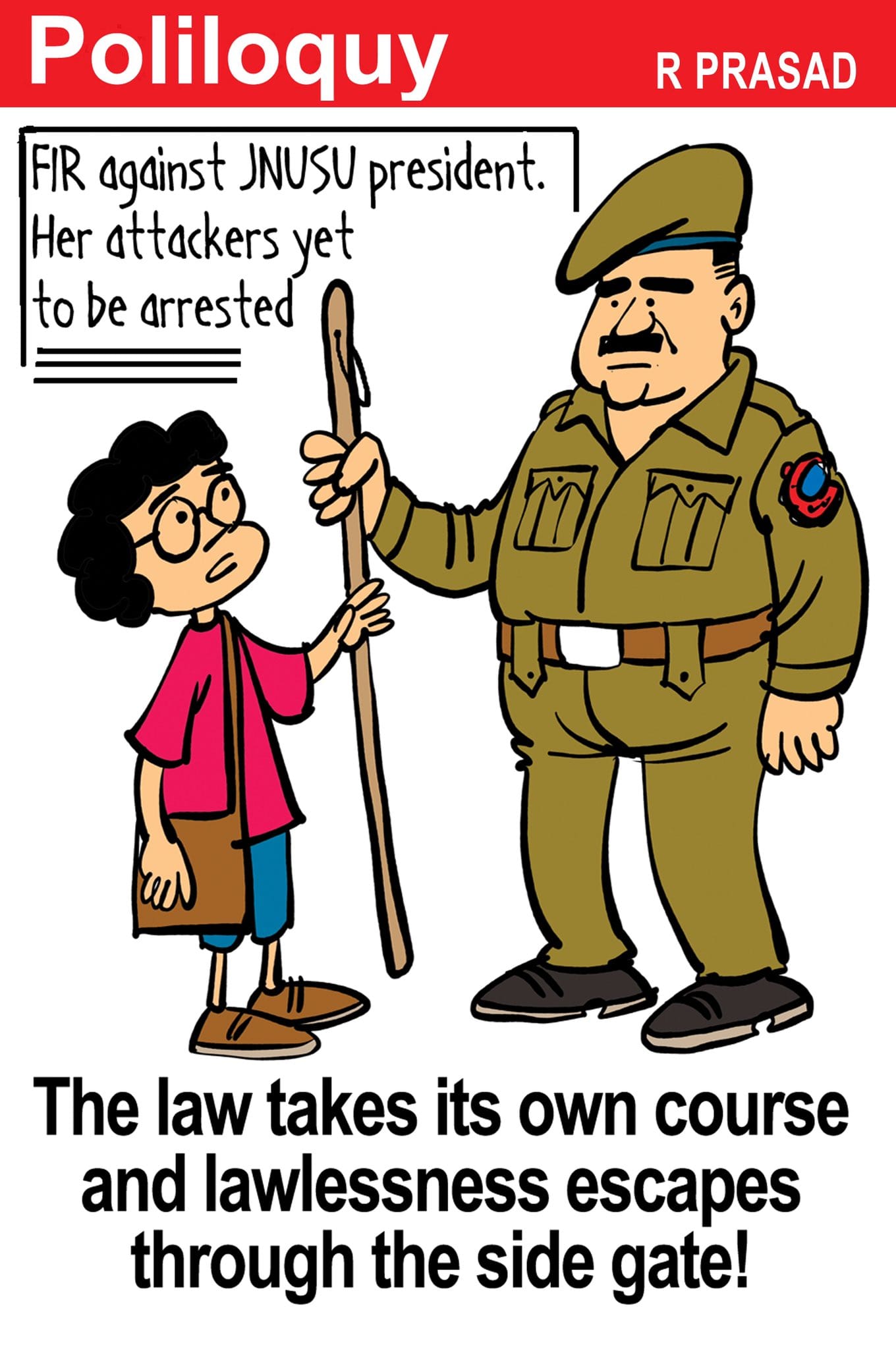 आर प्रसाद जेएनयूएसयू की अध्यक्ष आइशी घोष को दर्शाते हैं, जो कि रविवार रात खुद गुंडों की हिंसा का शिकार हुई थी. लेकिन, हिंसा के वास्तविक अपराधी स्वतंत्र हैं.