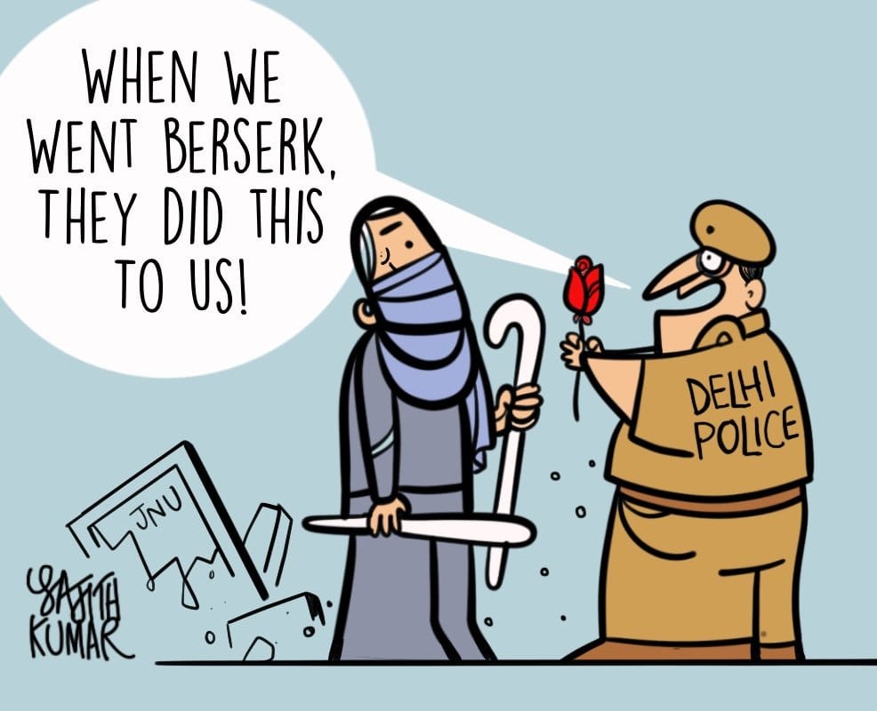 साजिथ कुमार दर्शाते हैं कि दिल्ली पुलिस जेएनयू में हिंसा फ़ैलाने वालों के सामने गिड़गिड़ा रही है.