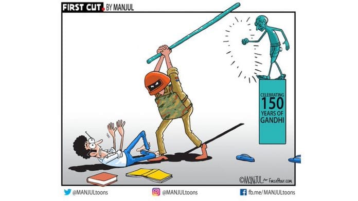 आज के फीचर कार्टून में, मंजुल ने बताया कि किस तरह से लाठी, जिसे कभी महात्मा गांधी ने अपने अहिंसक विरोध में इस्तेमाल किया था, अब मोदी के भारत में असंतोष को दबाने के लिए इस्तेमाल किया जा रहा है.