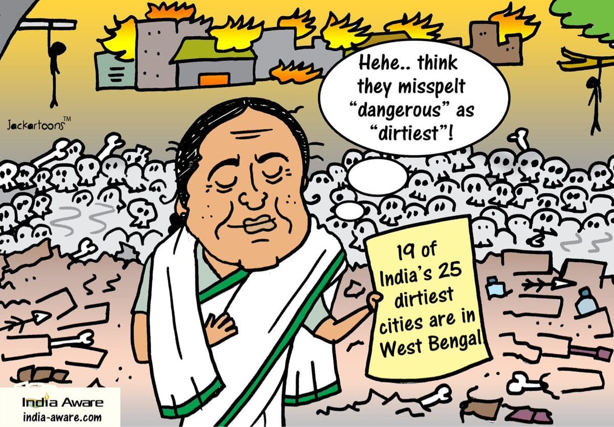 इंडिया अवेयर .कॉम के लिए अपने कार्टून में संकेत जैक ने व्यंग किया है कि आज वह पश्चिम बंगाल की स्थिति पर क्या सुझाव दे। मंगलवार को, स्वच्छता स्थिति रिपोर्ट के आंकड़ों से पता चला कि भारत के 25 सबसे गंदे शहरों में से 19 पश्चिम बंगाल राज्य में थे, जहा हाल ही में चुनाव से संबंधित हिंसा देखी गयी ।