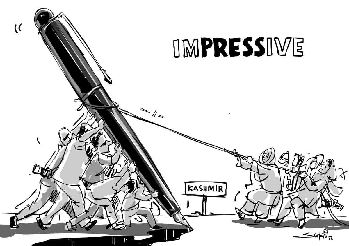 सुहेल नक्शबंदी ने अपने कार्टून में घाटी के पत्रकारों द्वारा की गयी शांत रैली पर टिप्पणी की, जो राइजिंग कश्मीर संपादक शुजात बुखारी की हालिया हत्या की निंदा करते हैं। कार्टूनिस्ट कहते हैं, लोगों के समर्थन के साथ, प्रेस की शक्ति फिर से घाटी में बहाल की जा सकती है।
