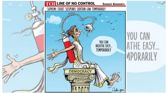 आज के फीचर कार्टून में संदीप अध्वर्यु ने सुप्रीम कोर्ट द्वारा राजद्रोह कानून यानी आईपीसी की धारा 124ए को फिलहाल के लिए रद्द किए जाने के बाद लोकतंत्र को खुलकर सांस लेते हुए दिखाया है.