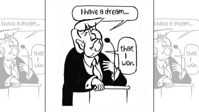 आज के प्रदर्शित कार्टून में इंडियन एक्सप्रेस में ई.पी. उन्नी, अमेरिकी राष्ट्रपति डोनाल्ड ट्रम्प की जीत को लेकर उनकी आत्म-घोषणा पर टिप्पणी करते है क्योंकि प्रमुख राज्यों में गिनती अभी जारी है.