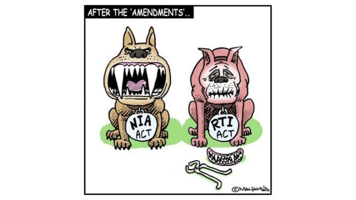 आज के प्रदर्शित कार्टून में, महमूद इस सप्ताह दो विवादास्पद संशोधनों को राष्ट्रीय जांच एजेंसी (एनआईए) विधेयक और सूचना का अधिकार (आरटीआई) अधिनियम (संशोधन) विधेयक से संबद्ध किया है. पहला केंद्रीय एजेंसी को सशक्त बनाना चाहता है जबकि दूसरा सूचना आयोगों को कमजोर कर सकता है.