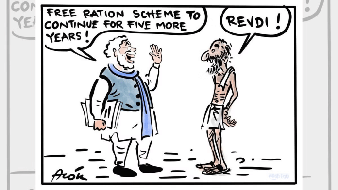 आज का विशेष कार्टून केंद्र द्वारा पीएम गरीब कल्याण योजना के विस्तार की पृष्ठभूमि पर आधारित है, जिससे राशन कार्ड धारकों को मुफ्त 5 किलोग्राम खाद्यान्न की अनुमति मिलती है. आलोक निरंतर ने भाजपा सरकार द्वारा इस तरह की योजना को मंजूरी दिए जाने पर व्यंग्य किया है, जबकि अन्य पार्टियों की ‘मुफ्तखोरी या रेवड़ी संस्कृति’ की राजनीति करने के लिए आलोचना की है.