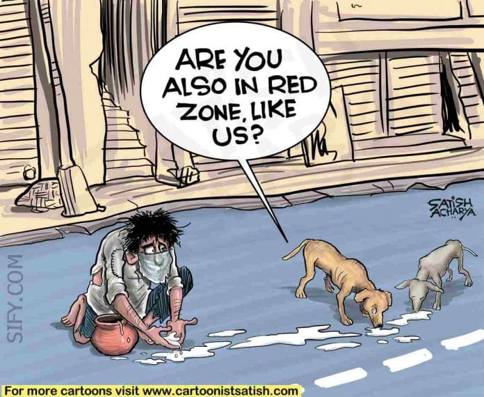 सतीश आचार्य दर्दनाक वीडियो को दर्शाते हैं. एक व्यक्ति रोड पर से दूध उठा रहा था और साथ ही कुत्ते भी दूध पी रहे थे वह कहते हैं कि ये अलग प्रकार का रेड जोन है.
