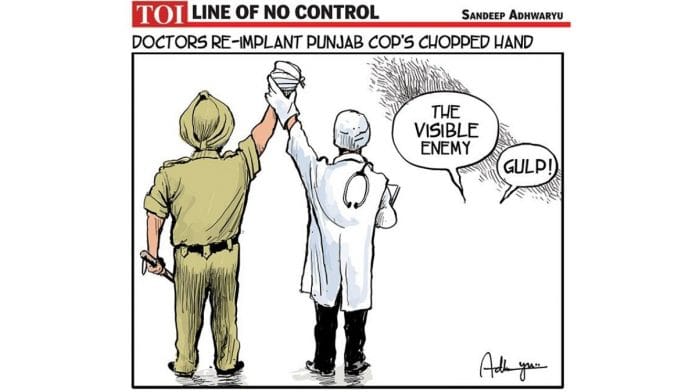 आज के फीचर कार्टून में संदीप अध्वर्यु पंजाब के निहंग समुदाय द्वारा पुलिस पर हमले को दर्शाते हैं. डॉक्टर का हाथ दुबारा जोड़ दिया गया हैं. संदीप इसका चित्रण करते हैं.