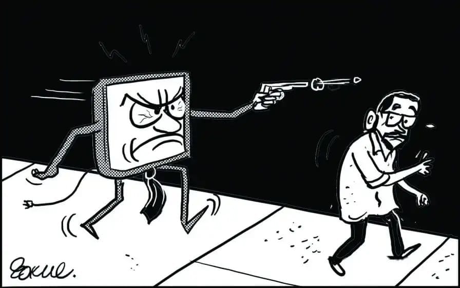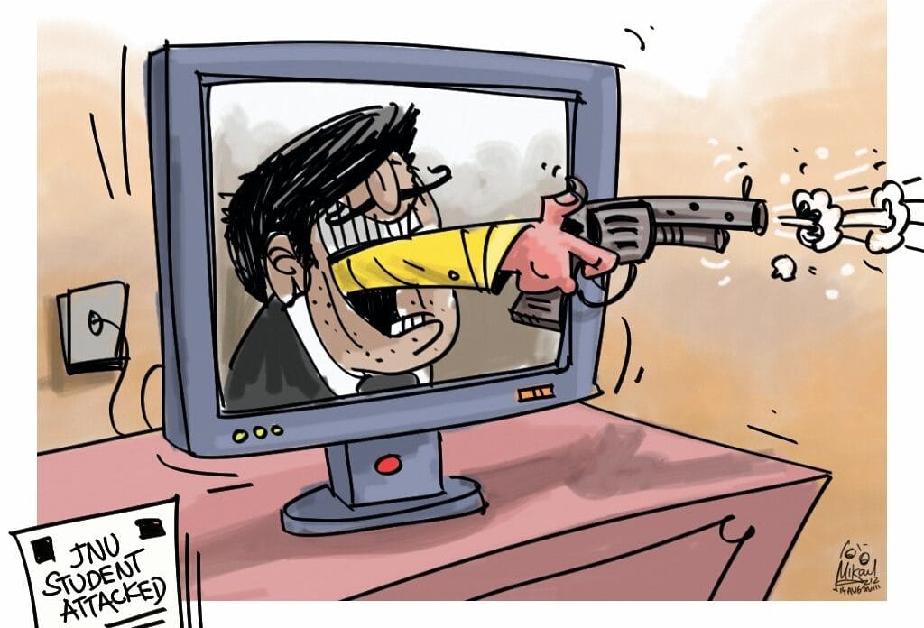 कार्टूनिस्ट मीका अज़ीज़ ने दर्शाया है की किस प्रकार ब्रॉडकास्ट मीडिया द्वारा उमर खालिद पर हमला किया गया और कैसे प्राइम टाइम बहस में उनके खिलाफ घृणा फैलाई गयी।