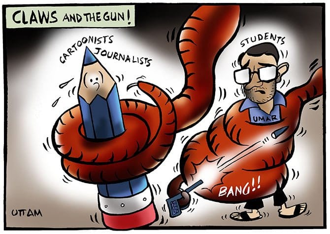 कार्टूनिस्ट उत्तम बताते हैं कि प्रेस की स्वतंत्रता खतरे में है और सोमवार को छात्र-कार्यकर्ता उमर खालिद पर हमला हुआ। पूर्व मेल टुडे कार्टूनिस्ट सतीश आचार्य ने अपने पद से इस्तीफा दे दिया ,संपादक द्वैपायन बोस ने उनके कार्टून को खारिज कर दिया था और इसे एक फोटो के साथ बदल दिया था । कार्टून में दक्षिण एशिया पर चीन के बढ़ते प्रभाव को दर्शाया था |