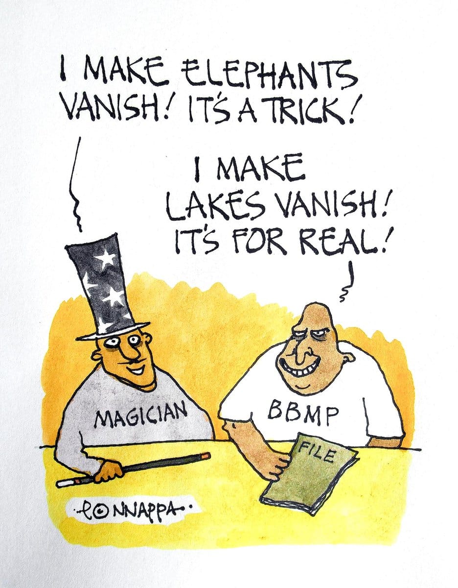 नाला पोनप्पा बेंगलुरु में लुप्त हो रही झीलों पर तंज करते हैं. बृहत बेंगलुरु महानगर पालिक (बीबीएमपी) ने पिछले हफ्ते कर्नाटक उच्च न्यायालय को एक ज्ञापन सौंपा था, जिसमें कहा गया था कि बीबीएमपी के कब्जे में 168 झीलें थीं, जिनमें से 17 झीलें अपनी विशेषताएं खो चुकी हैं.
