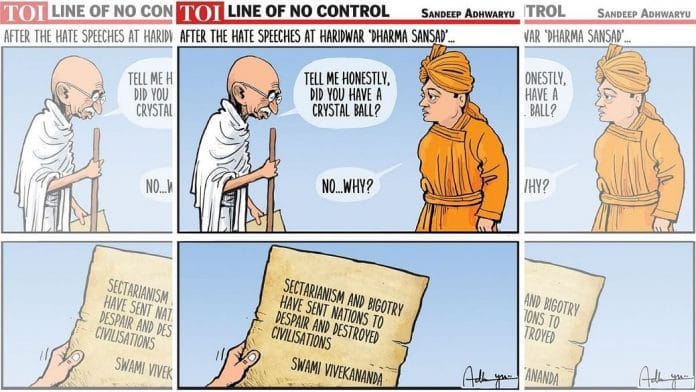 आज के चित्रित कार्टून में, संदीप अध्वर्यु ने हरिद्वार में ‘धर्म संसद’ जिसमें नफरत फैलाने वाले भाषण और मुसलमानों के खिलाफ हिंसा का अपील की गई को लेकर महात्मा गांधी को स्वामी विवेकानंद से पूछते हुए दिखाया कि उन्होंने कैसे राष्ट्रों को तोड़ने को लेकर धर्मांधता पर इतनी दूरदर्शिता दिखाई थी.