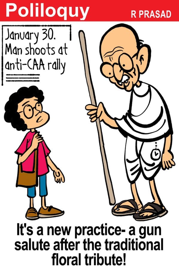 आर प्रसाद जामिया नगर में 30 जनवरी को हुए गोली प्रकरण पर व्यंग करते हैं. यह घटना महात्मा गांधी के पुण्यतिथि के दिन हुई है.