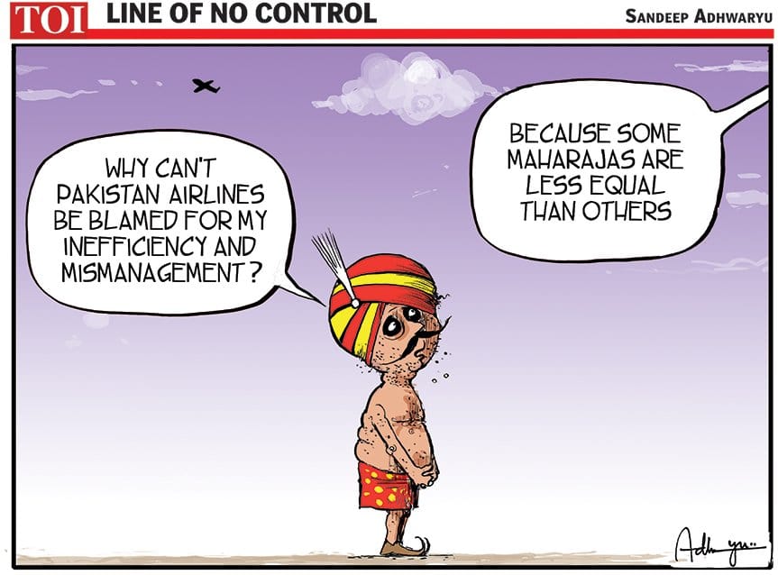 संदीप अध्वर्यु दर्शाते हैं कि एयर इंडिया को बेचा जा रहा है. वह आश्चर्य जताते हैं कि अक्षमता और कुप्रबंधन के लिए पाकिस्तान को दोषी ठहराया जा सकता है.