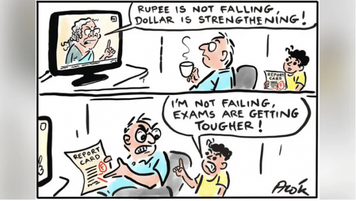 आज के चित्रित कार्टून में, आलोक निरंतर पिछले सप्ताह वाशिंगटन डीसी में एक प्रेस कॉन्फ्रेंस के दौरान केंद्रीय वित्त मंत्री निर्मला सीतारमण की टिप्पणी पर अपनी राय दे रहे हैं. अमेरिकी के मुकाबले अब तक के सबसे निचले स्तर पर भारतीय रुपए के मूल्य के गिरने के बारे में पूछे गए एक सवाल के जवाब में सीतारमण ने कहा, ‘मैं इसे ऐसे नहीं देखूंगी कि रुपए नहीं गिर रहा है बल्कि इसे डॉलर के मजबूत होने के रूप में देखूंगी.’