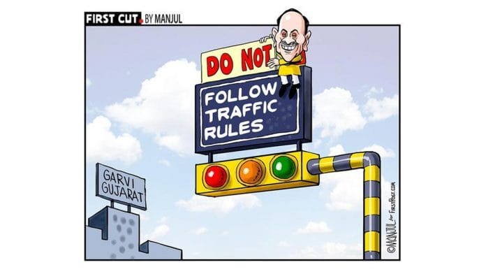 आज के फोटो फीचर में मंजुल गुजरात में विजय रूपाणी की सरकार का उपहास कर रहे हैं. गुजरात सरकार ने नए ट्रैफिक नियमों के अंतर्गत काटे गए चालानों को आधा कर दिया है.