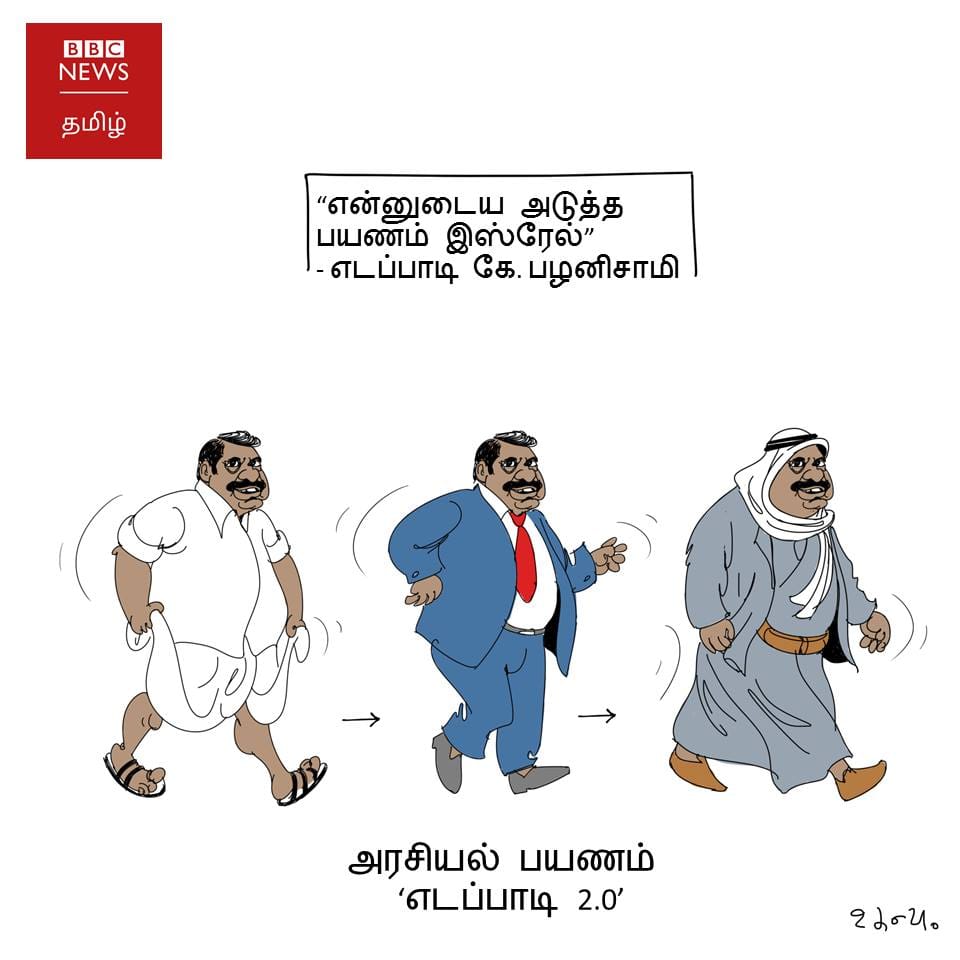 गोपाल शून्य तमिलनाडु के सीएम के. पलानीस्वामी की हाल ही में अमेरिका, यूके और यूएई की ट्रिप को चित्रित कर रहे हैं. वह निवेश के सिलसिले में गए हुए हैं. कार्टूनिस्ट दिखा रहे हैं कि वो इडापड्डी 2.0 में बदल गए हैं.