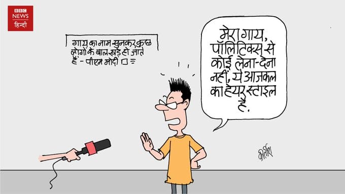 नरेंद्र मोदी के बयान को लेकर कीर्तीश भट्ट तंज कस रहे हैं. मोदी ने कहा था कि जब भी गाय का नाम आता है तो लोगों के बाल खड़े हो जाते हैं. कीर्तीश दिखा रहे हैं कि आज के लोग कह रहे हैं कि ये आज का फैशन है जिसका गाय और राजनीति से लेना देना नहीं है.