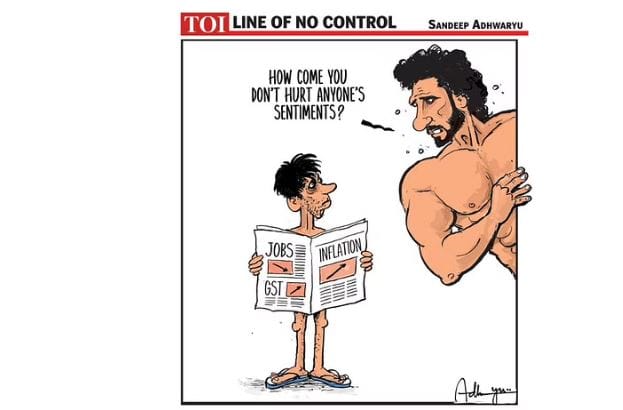 आज के प्रदर्शित कार्टून में, संदीप अध्वर्यु ने रणवीर सिंह के फोटोशूट पर नाराजगी की ओर इशारा किया है – जिसके लिए अभिनेता अब पुलिस मामले का सामना कर रहे हैं – जबकि मुद्रास्फीति, रोजगार में गिरावट, और जीएसटी मुद्दे पृष्ठभूमि में शामिल हैं.