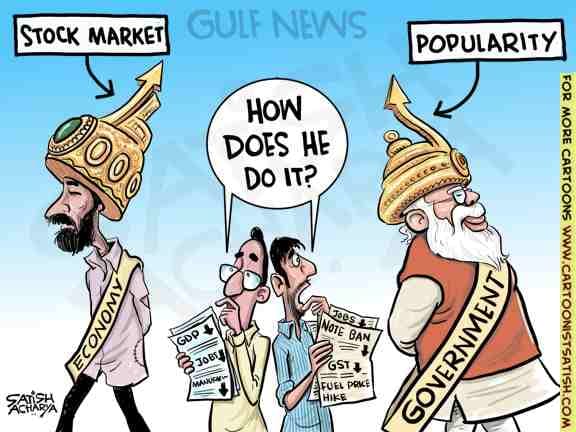 सतीश आचार्य का कार्टून पूछता है कि बेरोजगारी और जीडीपी में गिरावट के बावजूद प्रधानमंत्री नरेंद्र मोदी की लोकप्रियता कैसे बढ़ रही है.