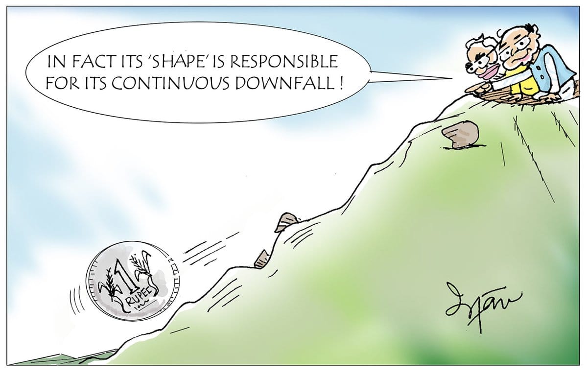 आउटलुक में इरफ़ान रुपये के गिरते मूल्य पर मज़ाकिया अंदाज़ में तंज करते है, भले ही सरकार इसके लिए बेतुके कारण बताती है.