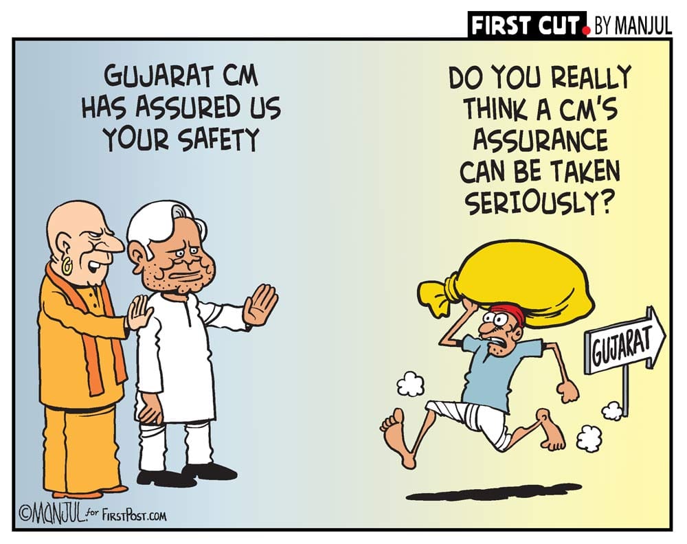 गुजरात हिंसा के परिणामस्वरूप, फर्स्टपोस्ट में मंजुल मुख्यमंत्री योगी आदित्यनाथ और बिहार के मुख्यमंत्री नीतीश कुमार के द्वारा उन प्रवासी श्रमिकों को आश्वासन देने पर जो गुजरात छोड़कर बाहर जा रहे है उनपर तंज कर रहे है.