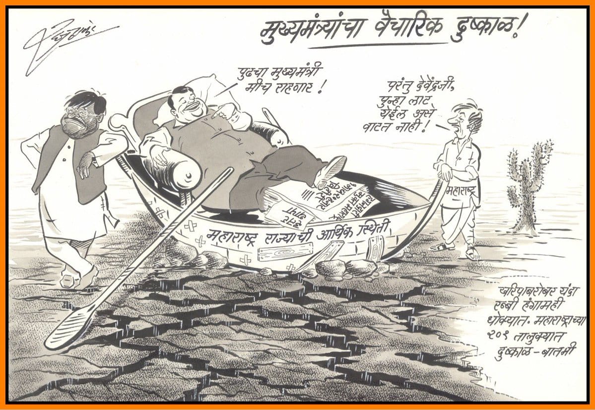 “मुख्यमंत्री का वैचारिक सूखा” नामक शीर्षक पर कार्टून में राज ठाकरे ने महाराष्ट्र के कई जिलों में मौजूदा सूखा जैसी स्थिति पर एक व्यंग्य किया है, जबकि मुख्यमंत्री देवेंद्र फडणवीस के चार साल पूरे होने वाले है.