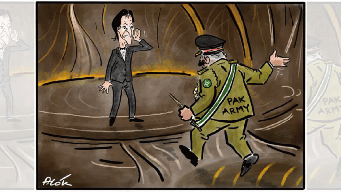 आज के विशेष रूप से प्रदर्शित कार्टून में, आलोक निरंतर ने देश के राजनीतिक मामलों पर पाकिस्तानी सेना के प्रभाव पर टिप्पणी की है, क्योंकि वह प्रधानमंत्री इमरान खान की स्थिति की तुलना कॉमेडियन क्रिस रॉक से करते हैं, जिन्हें हॉलीवुड अभिनेता विल स्मिथ ने इस सप्ताह के शुरू में अपनी पत्नी जैडा पिंकेट स्मिथ के बारे में मजाक उड़ाने पर ऑस्कर मंच पर उन्हें थप्पड़ मारा था.
