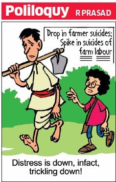 2016 में कृषि श्रम द्वारा आत्महत्या में 10 फीसदी की वृद्धि के मुक़ाबले किसान आत्महत्या में 20 फीसदी की गिरावट आयी है। आर. प्रसाद दुखद सच्चाई को दर्शाते हैं। (किसानों की आत्महत्या में कमी लेकिन कृषि श्रमिकों की आत्महत्या में बढ़ोतरी ),(संकट कम हो रहा है, वास्तव में कम हो रहा है )