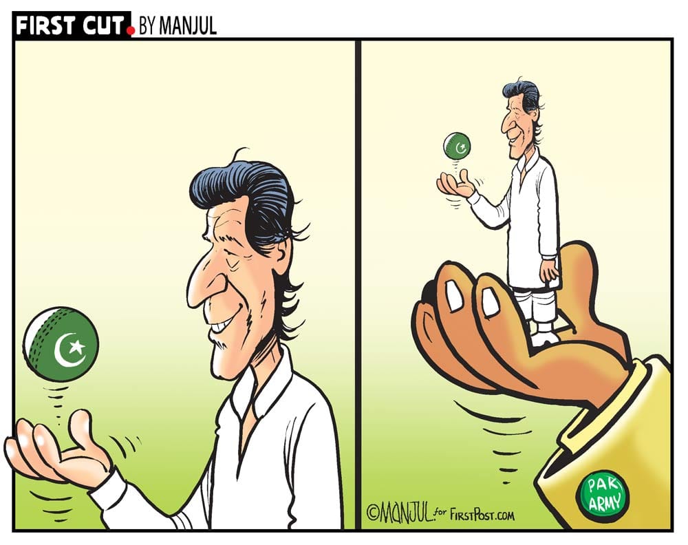 कार्टूनिस्ट मंजुल उसी तरह व्यंग करते हैं,बावजूद इसके की खान ने क्रिकेट गेंद को ऊपर टॉस करने के लिए फेंकते है जिसमें पाकिस्तान का ध्वज है। खुद खान पाकिस्तान सेना की दया पर है दिखाया गया है जिसको की एक बड़े हाथ के रूप में दिखाया गया है।